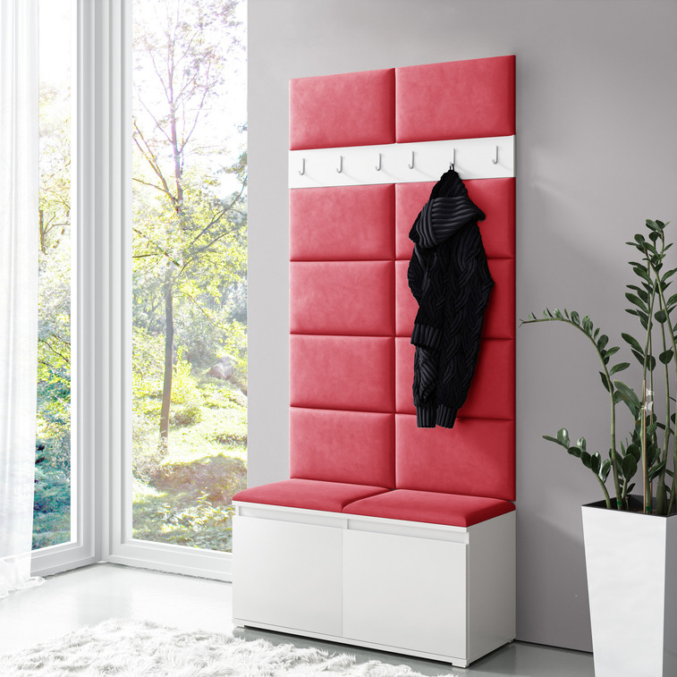 Predsieňová stena Emi 1. Obsahuje: botník, vešiak, 12x čalúnené panely. Čalúnené panely sa montujú priamo na stenu, na skriňu a na botník pomocou lepidla. Lepidlo nie je súčasťou balenia.