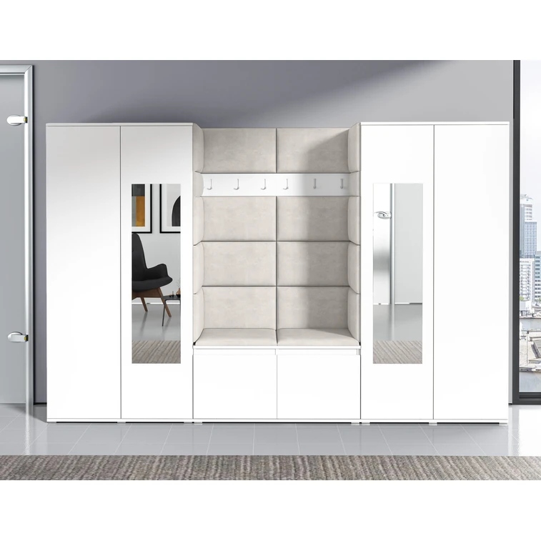 Predsieňová stena Emi 10. Obsahuje: 2x dvojdverovú šatníkovú skriňu so zrkadlom, 1x botník, 1x vešiak, 20x čalúnené panely. Čalúnené panely sa montujú priamo na stenu, na skriňu a na botník pomocou lepidla. Lepidlo nie je súčasťou balenia.