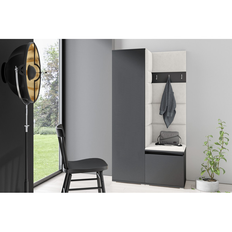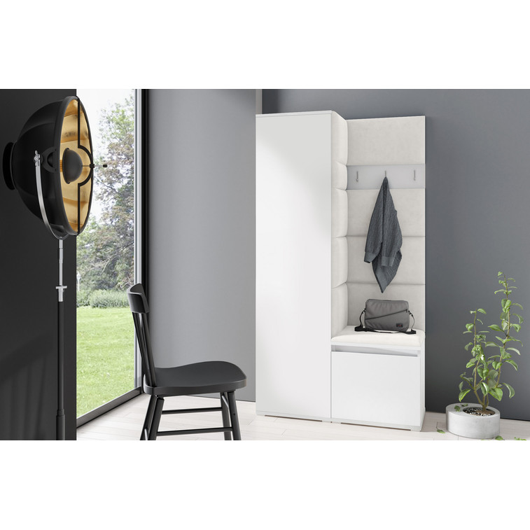 Predsieňová stena Emi 13. Obsahuje: 1x šatníková skriňa so zrkadlom, 1 botník, 1x vešiak, 10x čalúnené panely. Čalúnené panely sa montujú priamo na stenu, na skriňu a na botník pomocou lepidla. Lepidlo nie je súčasťou balenia.