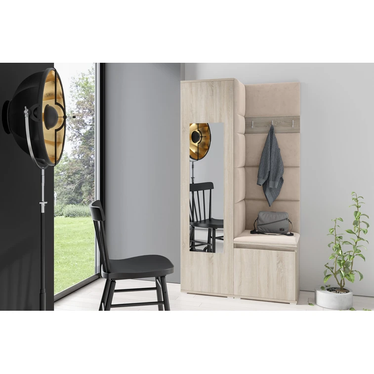 Predsieňová stena Emi 13. Obsahuje: 1x šatníková skriňa so zrkadlom, 1 botník, 1x vešiak, 10x čalúnené panely. Čalúnené panely sa montujú priamo na stenu, na skriňu a na botník pomocou lepidla. Lepidlo nie je súčasťou balenia.