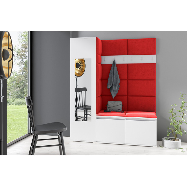 Predsieňová stena Emi 14. Obsahuje: 1x šatníková skriňa so zrkadlom, 1 botník, 1x vešiak, 15x čalúnené panely. Čalúnené panely sa montujú priamo na stenu, na skriňu a na botník pomocou lepidla. Lepidlo nie je súčasťou balenia.