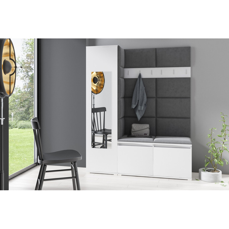 Predsieňová stena Emi 14. Obsahuje: 1x šatníková skriňa so zrkadlom, 1 botník, 1x vešiak, 15x čalúnené panely. Čalúnené panely sa montujú priamo na stenu, na skriňu a na botník pomocou lepidla. Lepidlo nie je súčasťou balenia.