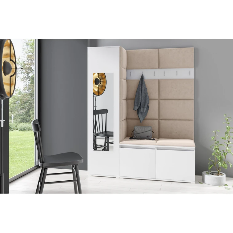 Predsieňová stena Emi 14. Obsahuje: 1x šatníková skriňa so zrkadlom, 1 botník, 1x vešiak, 15x čalúnené panely. Čalúnené panely sa montujú priamo na stenu, na skriňu a na botník pomocou lepidla. Lepidlo nie je súčasťou balenia.