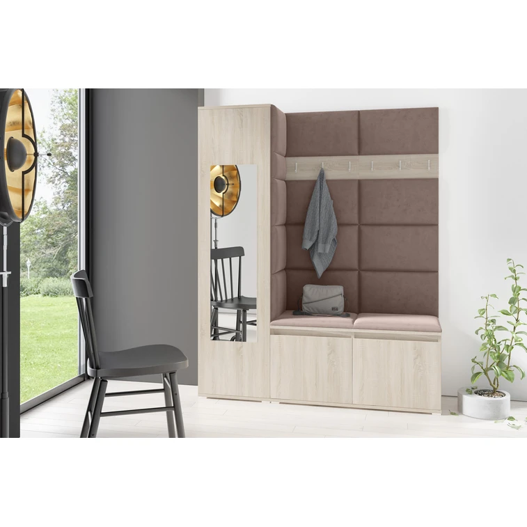 Predsieňová stena Emi 14. Obsahuje: 1x šatníková skriňa so zrkadlom, 1 botník, 1x vešiak, 15x čalúnené panely. Čalúnené panely sa montujú priamo na stenu, na skriňu a na botník pomocou lepidla. Lepidlo nie je súčasťou balenia.