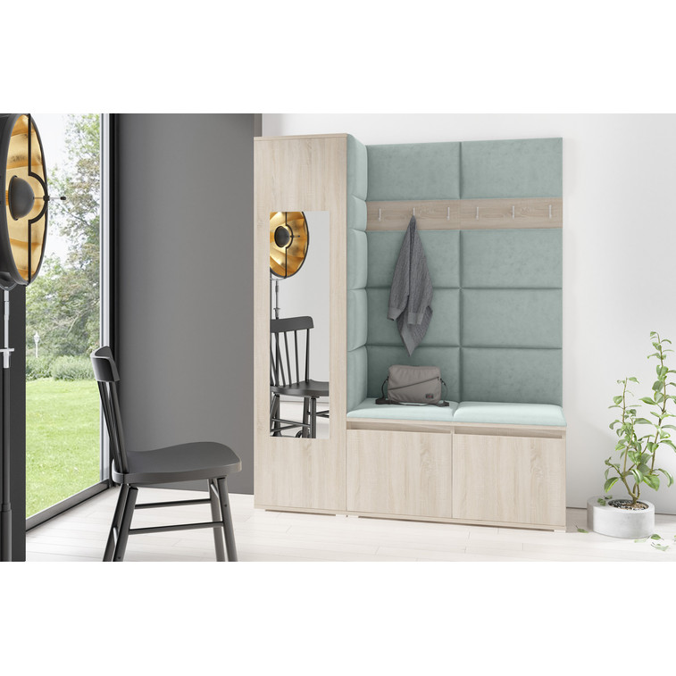 Predsieňová stena Emi 14. Obsahuje: 1x šatníková skriňa so zrkadlom, 1 botník, 1x vešiak, 15x čalúnené panely. Čalúnené panely sa montujú priamo na stenu, na skriňu a na botník pomocou lepidla. Lepidlo nie je súčasťou balenia.
