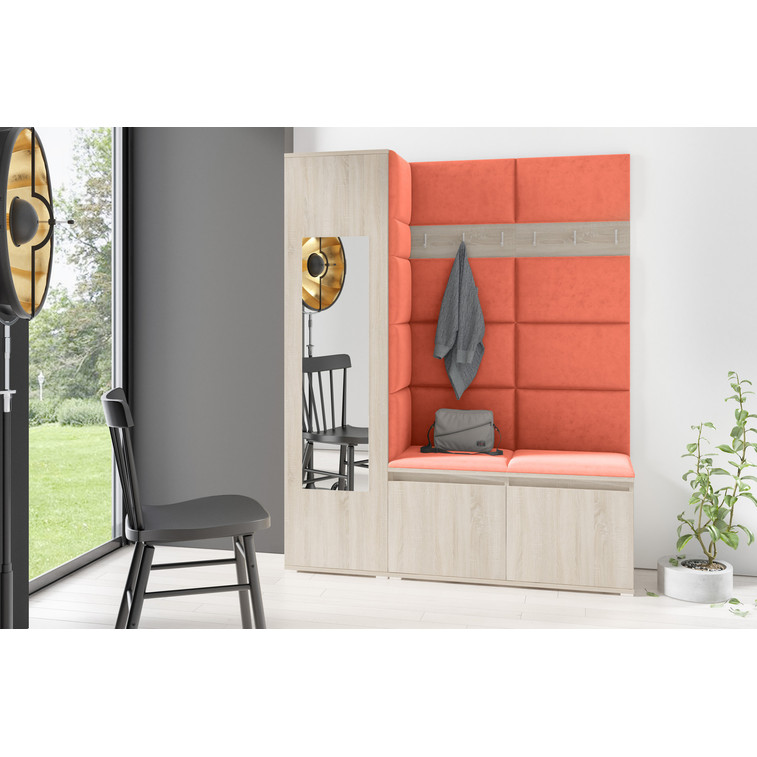 Predsieňová stena Emi 14. Obsahuje: 1x šatníková skriňa so zrkadlom, 1 botník, 1x vešiak, 15x čalúnené panely. Čalúnené panely sa montujú priamo na stenu, na skriňu a na botník pomocou lepidla. Lepidlo nie je súčasťou balenia.