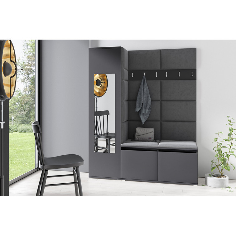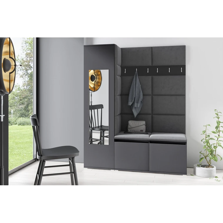 Predsieňová stena Emi 14. Obsahuje: 1x šatníková skriňa so zrkadlom, 1 botník, 1x vešiak, 15x čalúnené panely. Čalúnené panely sa montujú priamo na stenu, na skriňu a na botník pomocou lepidla. Lepidlo nie je súčasťou balenia.