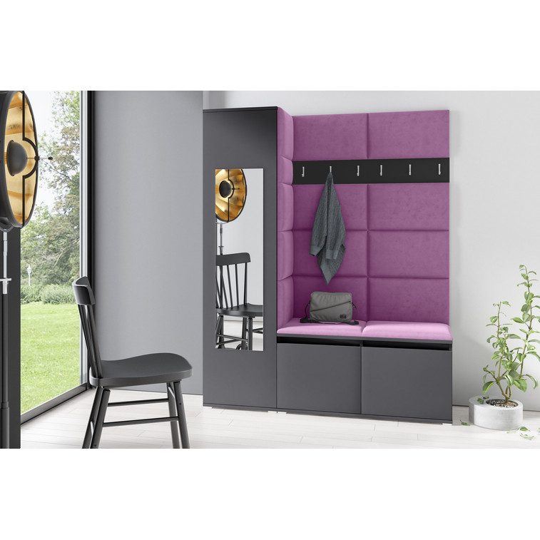 Predsieňová stena Emi 14. Obsahuje: 1x šatníková skriňa so zrkadlom, 1 botník, 1x vešiak, 15x čalúnené panely. Čalúnené panely sa montujú priamo na stenu, na skriňu a na botník pomocou lepidla. Lepidlo nie je súčasťou balenia.