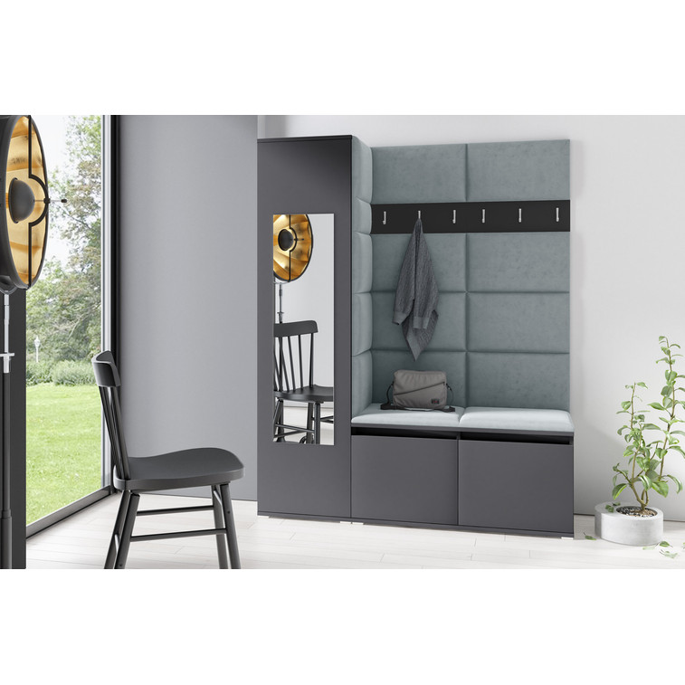 Predsieňová stena Emi 14. Obsahuje: 1x šatníková skriňa so zrkadlom, 1 botník, 1x vešiak, 15x čalúnené panely. Čalúnené panely sa montujú priamo na stenu, na skriňu a na botník pomocou lepidla. Lepidlo nie je súčasťou balenia.
