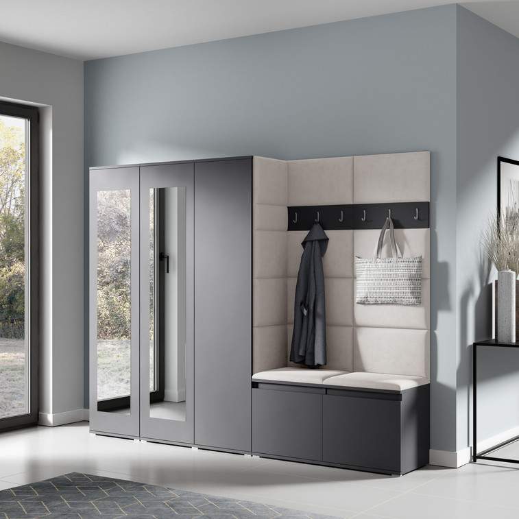 Predsieňová stena Emi 15. Obsahuje: 1x dvojdverová šatníková skriňa so zrkadlom, 1x šatníková skriňa, 1x botník, 1x vešiak, 15x čalúnené panely. Čalúnené panely sa montujú priamo na stenu, na skriňu a na botník pomocou lepidla. Lepidlo nie je súčasťou balenia.