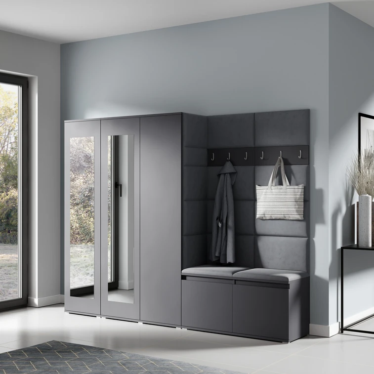 Predsieňová stena Emi 15. Obsahuje: 1x dvojdverová šatníková skriňa so zrkadlom, 1x šatníková skriňa, 1x botník, 1x vešiak, 15x čalúnené panely. Čalúnené panely sa montujú priamo na stenu, na skriňu a na botník pomocou lepidla. Lepidlo nie je súčasťou balenia.