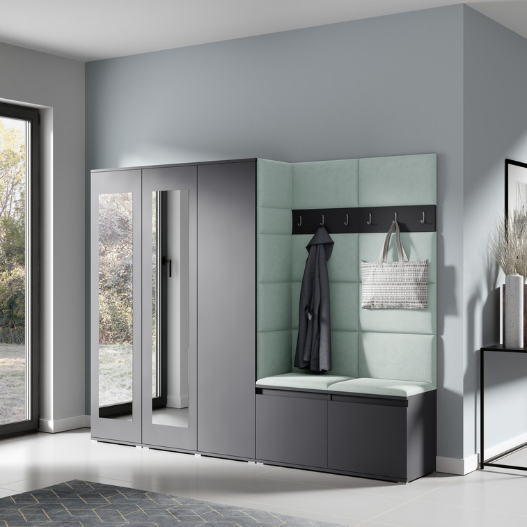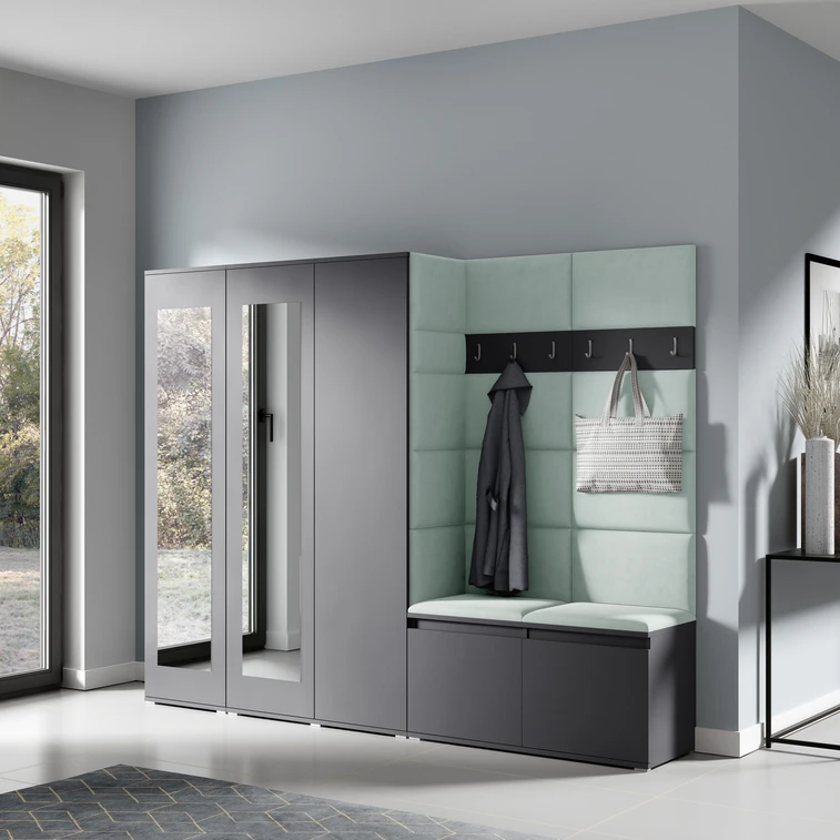 Predsieňová stena Emi 15. Obsahuje: 1x dvojdverová šatníková skriňa so zrkadlom, 1x šatníková skriňa, 1x botník, 1x vešiak, 15x čalúnené panely. Čalúnené panely sa montujú priamo na stenu, na skriňu a na botník pomocou lepidla. Lepidlo nie je súčasťou balenia.