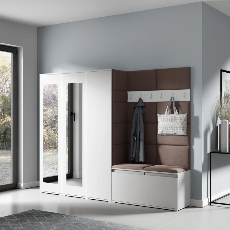 Predsieňová stena Emi 15. Obsahuje: 1x dvojdverová šatníková skriňa so zrkadlom, 1x šatníková skriňa, 1x botník, 1x vešiak, 15x čalúnené panely. Čalúnené panely sa montujú priamo na stenu, na skriňu a na botník pomocou lepidla. Lepidlo nie je súčasťou balenia.