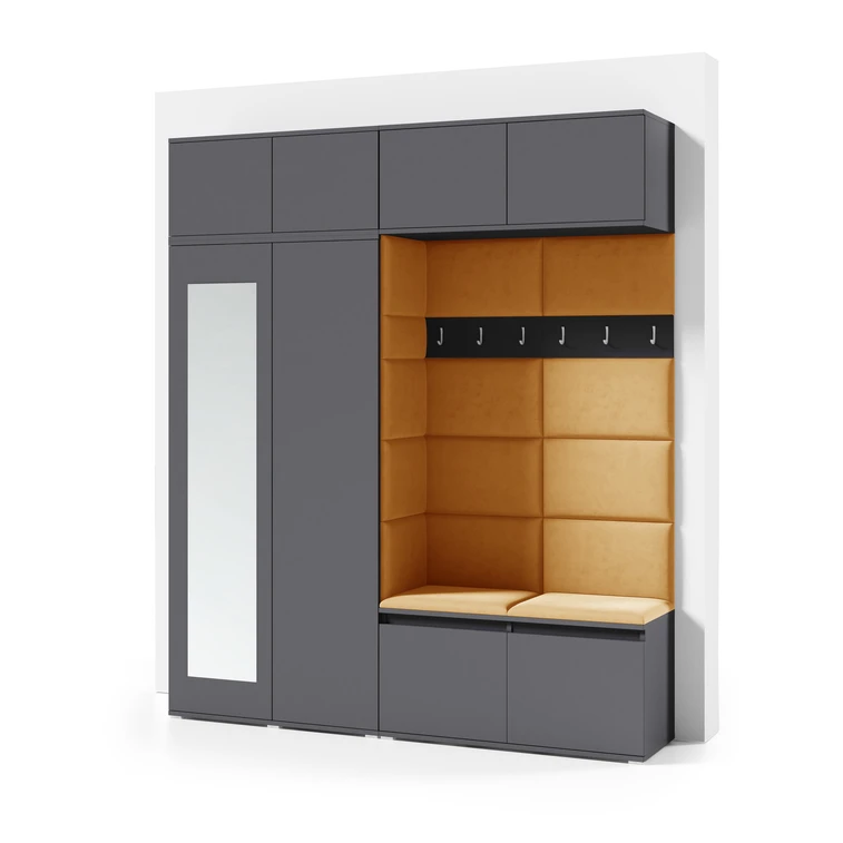 Predsieňová stena Emi 16. Obsahuje: 1x šatníkovú skriňu so zrkadlom, 1x predĺženie šatníkovej skrine, 1x závesná skrinka, 1x botník, 1x vešiak, 15x čalúnené panely. Čalúnené panely sa montujú priamo na stenu, na skriňu a na botník pomocou lepidla. Lepidlo nie je súčasťou balenia.