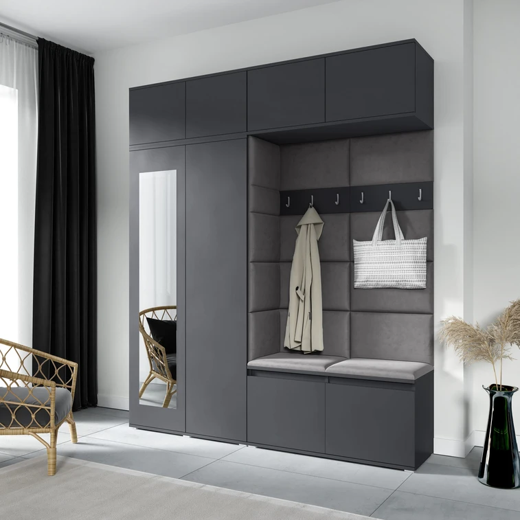 Predsieňová stena Emi 16. Obsahuje: 1x šatníkovú skriňu so zrkadlom, 1x predĺženie šatníkovej skrine, 1x závesná skrinka, 1x botník, 1x vešiak, 15x čalúnené panely. Čalúnené panely sa montujú priamo na stenu, na skriňu a na botník pomocou lepidla. Lepidlo nie je súčasťou balenia.