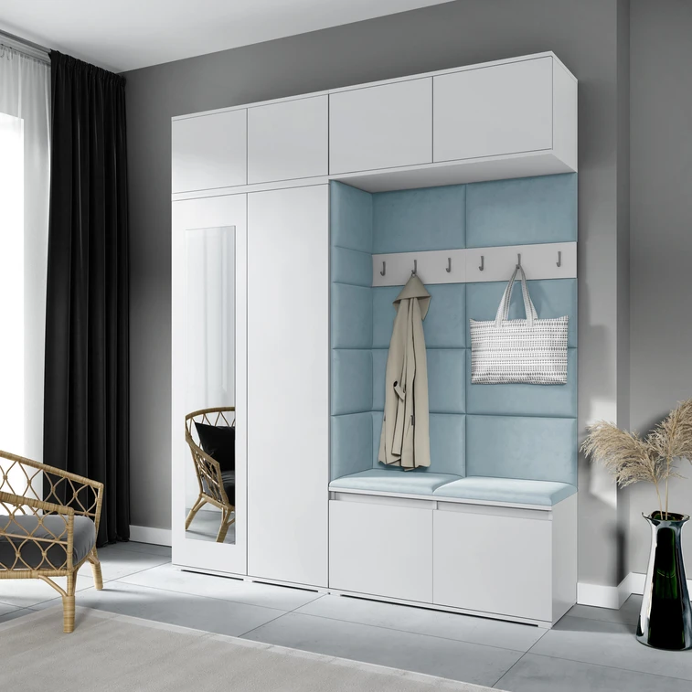 Predsieňová stena Emi 16. Obsahuje: 1x šatníkovú skriňu so zrkadlom, 1x predĺženie šatníkovej skrine, 1x závesná skrinka, 1x botník, 1x vešiak, 15x čalúnené panely. Čalúnené panely sa montujú priamo na stenu, na skriňu a na botník pomocou lepidla. Lepidlo nie je súčasťou balenia.