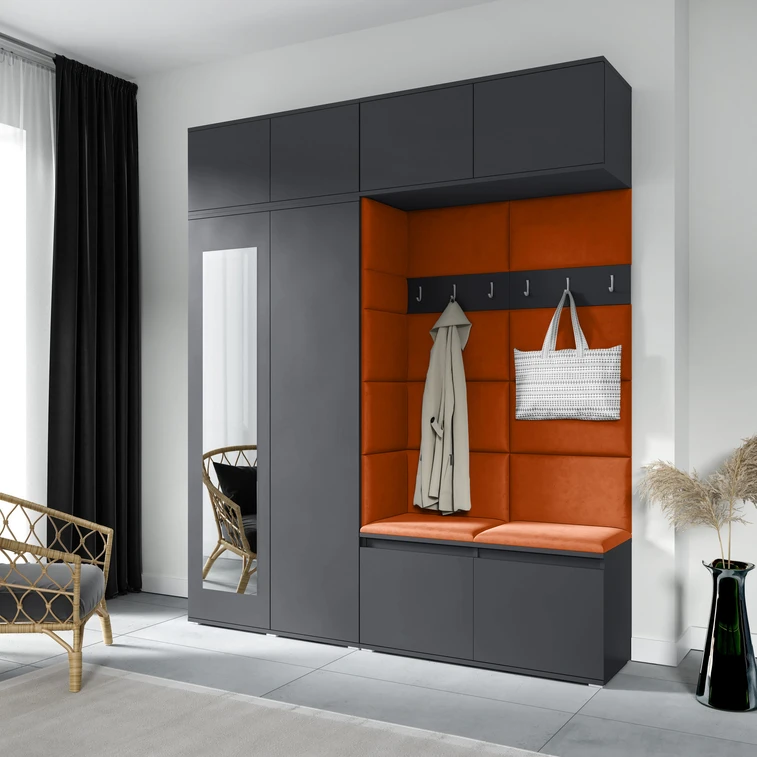 Predsieňová stena Emi 16. Obsahuje: 1x šatníkovú skriňu so zrkadlom, 1x predĺženie šatníkovej skrine, 1x závesná skrinka, 1x botník, 1x vešiak, 15x čalúnené panely. Čalúnené panely sa montujú priamo na stenu, na skriňu a na botník pomocou lepidla. Lepidlo nie je súčasťou balenia.