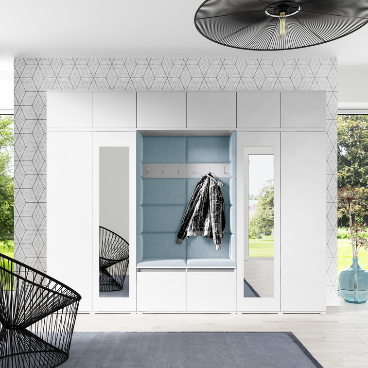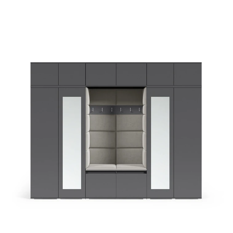 Predsieňová stena Emi 17. Obsahuje: 2x šatníkovú skriňu so zrkadlom, 2x predĺženie šatníkovej skrine, 1x závesná skrinka, 1x botník, 1x vešiak, 20x čalúnené panely. Čalúnené panely sa montujú priamo na stenu, na skriňu a na botník pomocou lepidla. Lepidlo nie je súčasťou balenia.