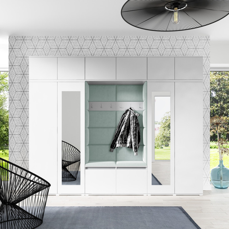 Predsieňová stena Emi 17. Obsahuje: 2x šatníkovú skriňu so zrkadlom, 2x predĺženie šatníkovej skrine, 1x závesná skrinka, 1x botník, 1x vešiak, 20x čalúnené panely. Čalúnené panely sa montujú priamo na stenu, na skriňu a na botník pomocou lepidla. Lepidlo nie je súčasťou balenia.