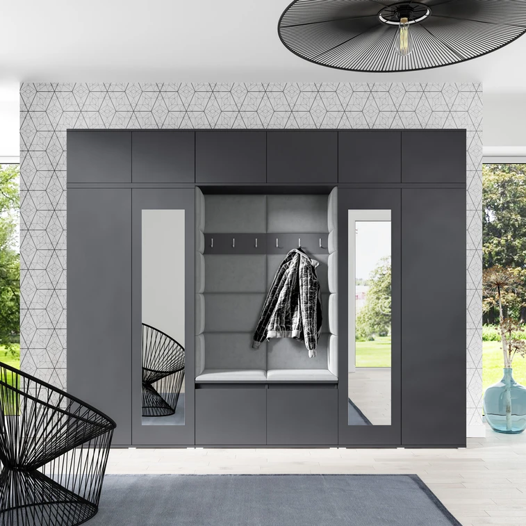 Predsieňová stena Emi 17. Obsahuje: 2x šatníkovú skriňu so zrkadlom, 2x predĺženie šatníkovej skrine, 1x závesná skrinka, 1x botník, 1x vešiak, 20x čalúnené panely. Čalúnené panely sa montujú priamo na stenu, na skriňu a na botník pomocou lepidla. Lepidlo nie je súčasťou balenia.