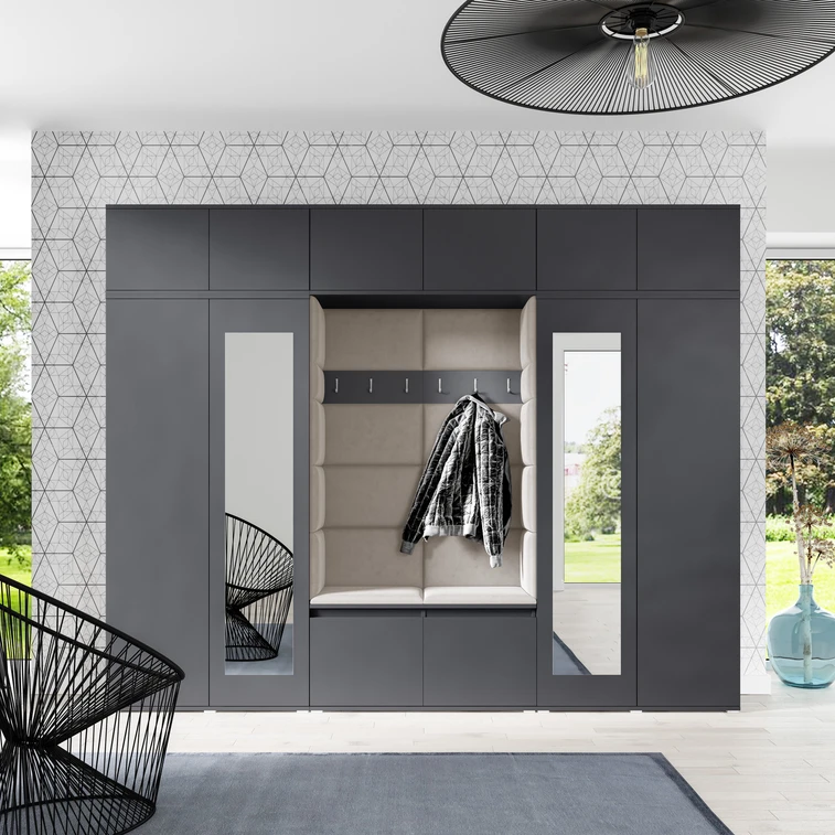 Predsieňová stena Emi 17. Obsahuje: 2x šatníkovú skriňu so zrkadlom, 2x predĺženie šatníkovej skrine, 1x závesná skrinka, 1x botník, 1x vešiak, 20x čalúnené panely. Čalúnené panely sa montujú priamo na stenu, na skriňu a na botník pomocou lepidla. Lepidlo nie je súčasťou balenia.