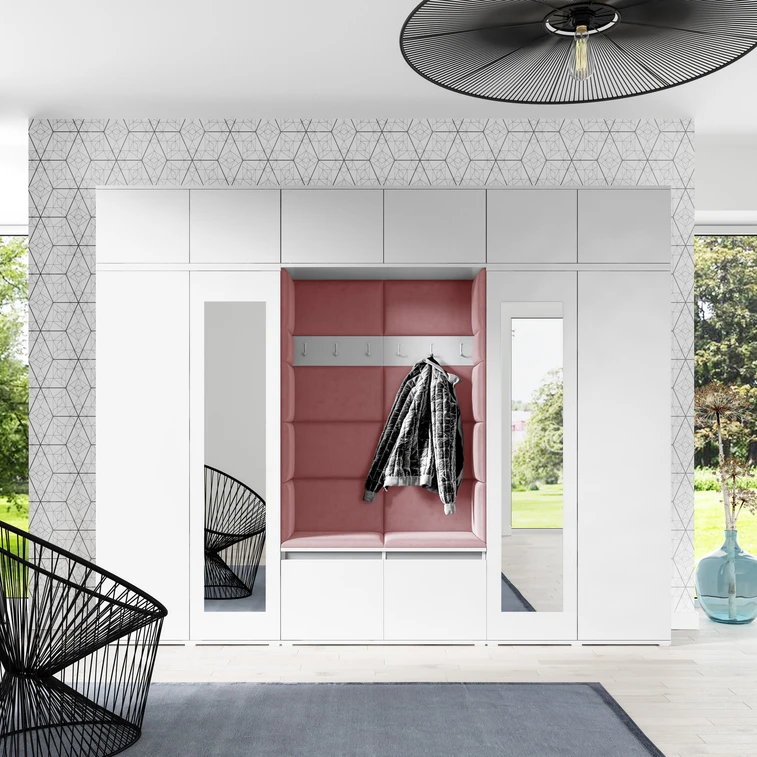 Predsieňová stena Emi 17. Obsahuje: 2x šatníkovú skriňu so zrkadlom, 2x predĺženie šatníkovej skrine, 1x závesná skrinka, 1x botník, 1x vešiak, 20x čalúnené panely. Čalúnené panely sa montujú priamo na stenu, na skriňu a na botník pomocou lepidla. Lepidlo nie je súčasťou balenia.