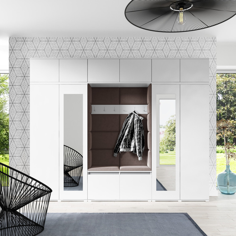 Predsieňová stena Emi 17. Obsahuje: 2x šatníkovú skriňu so zrkadlom, 2x predĺženie šatníkovej skrine, 1x závesná skrinka, 1x botník, 1x vešiak, 20x čalúnené panely. Čalúnené panely sa montujú priamo na stenu, na skriňu a na botník pomocou lepidla. Lepidlo nie je súčasťou balenia.