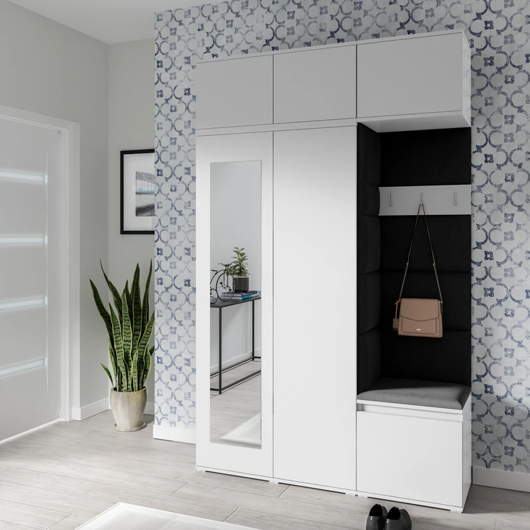Predsieňová stena Emi 18. Obsahuje: 1x šatníkovú skriňu so zrkadlom, 1x predĺženie šatníkovej skrine, 1x závesná skrinka, 1x botník, 1x vešiak, 10x čalúnené panely. Čalúnené panely sa montujú priamo na stenu, na skriňu a na botník pomocou lepidla. Lepidlo nie je súčasťou balenia.