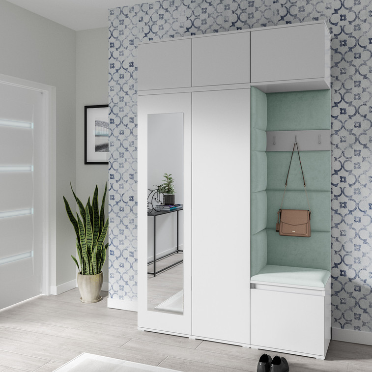 Predsieňová stena Emi 18. Obsahuje: 1x šatníkovú skriňu so zrkadlom, 1x predĺženie šatníkovej skrine, 1x závesná skrinka, 1x botník, 1x vešiak, 10x čalúnené panely. Čalúnené panely sa montujú priamo na stenu, na skriňu a na botník pomocou lepidla. Lepidlo nie je súčasťou balenia.