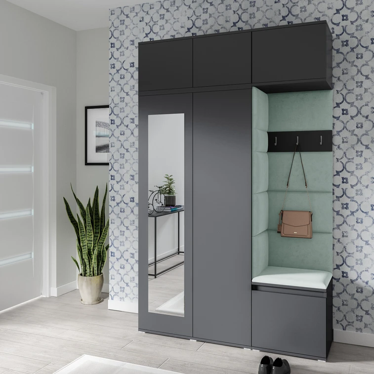 Predsieňová stena Emi 18. Obsahuje: 1x šatníkovú skriňu so zrkadlom, 1x predĺženie šatníkovej skrine, 1x závesná skrinka, 1x botník, 1x vešiak, 10x čalúnené panely. Čalúnené panely sa montujú priamo na stenu, na skriňu a na botník pomocou lepidla. Lepidlo nie je súčasťou balenia.