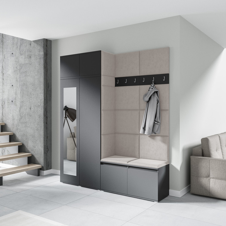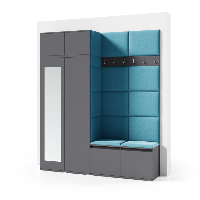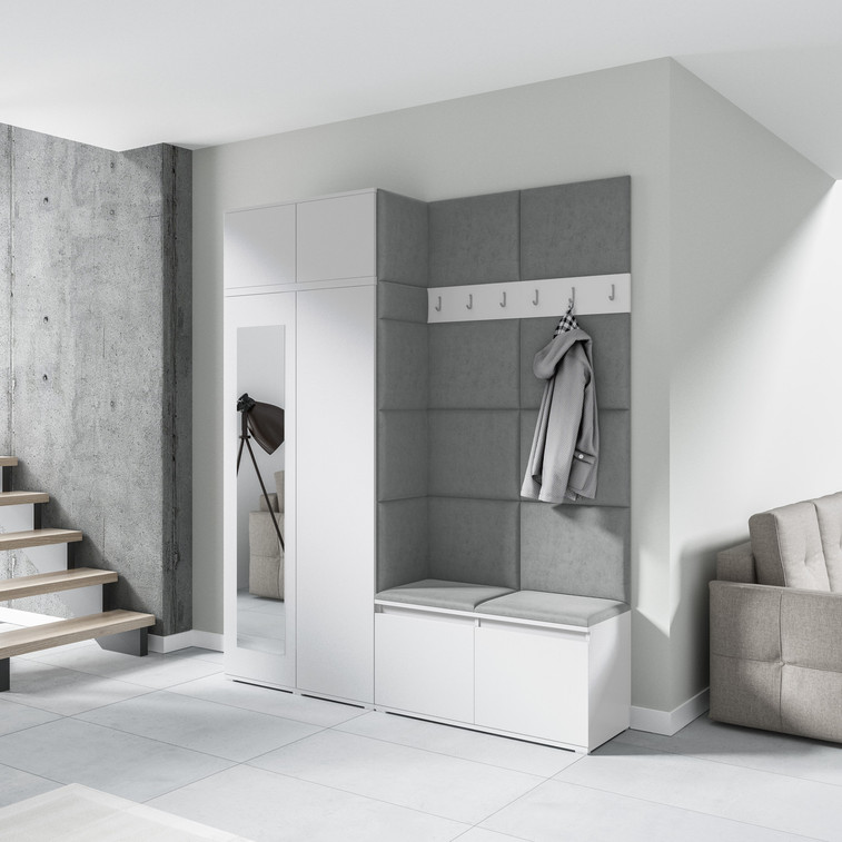 Predsieňová stena Emi 19. Obsahuje: 1x šatníkovú skriňu so zrkadlom, 1x predĺženie šatníkovej skrine, 1x botník, 1x vešiak, 15x čalúnené panely. Čalúnené panely sa montujú priamo na stenu, na skriňu a na botník pomocou lepidla. Lepidlo nie je súčasťou balenia.