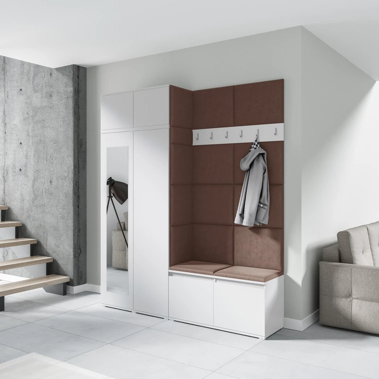 Predsieňová stena Emi 19. Obsahuje: 1x šatníkovú skriňu so zrkadlom, 1x predĺženie šatníkovej skrine, 1x botník, 1x vešiak, 15x čalúnené panely. Čalúnené panely sa montujú priamo na stenu, na skriňu a na botník pomocou lepidla. Lepidlo nie je súčasťou balenia.