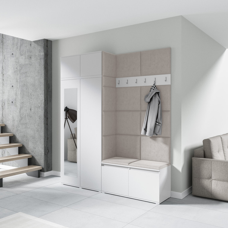 Predsieňová stena Emi 19. Obsahuje: 1x šatníkovú skriňu so zrkadlom, 1x predĺženie šatníkovej skrine, 1x botník, 1x vešiak, 15x čalúnené panely. Čalúnené panely sa montujú priamo na stenu, na skriňu a na botník pomocou lepidla. Lepidlo nie je súčasťou balenia.