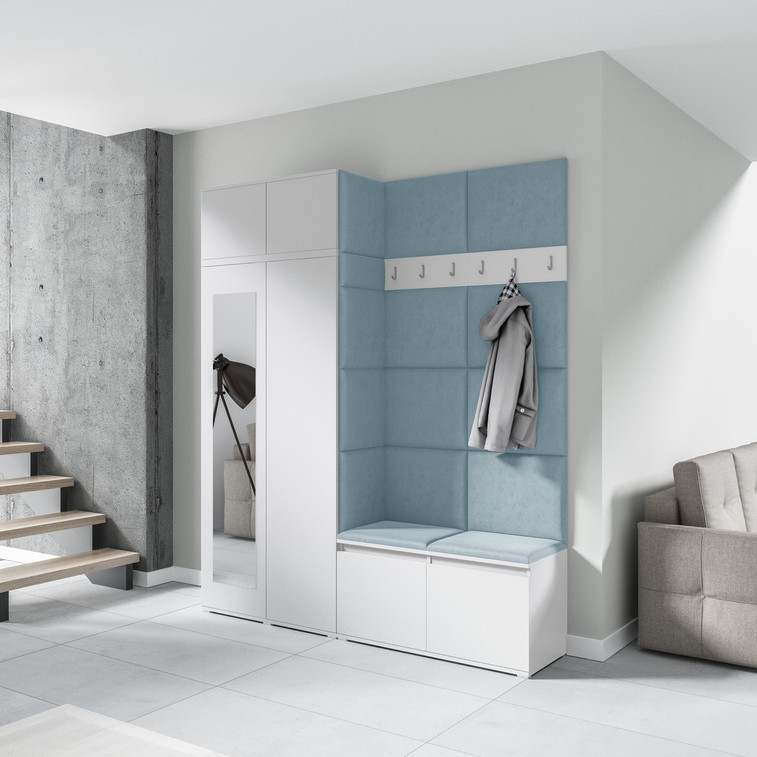 Predsieňová stena Emi 19. Obsahuje: 1x šatníkovú skriňu so zrkadlom, 1x predĺženie šatníkovej skrine, 1x botník, 1x vešiak, 15x čalúnené panely. Čalúnené panely sa montujú priamo na stenu, na skriňu a na botník pomocou lepidla. Lepidlo nie je súčasťou balenia.