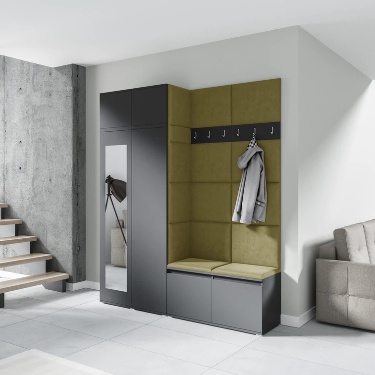 Predsieňová stena Emi 19. Obsahuje: 1x šatníkovú skriňu so zrkadlom, 1x predĺženie šatníkovej skrine, 1x botník, 1x vešiak, 15x čalúnené panely. Čalúnené panely sa montujú priamo na stenu, na skriňu a na botník pomocou lepidla. Lepidlo nie je súčasťou balenia.