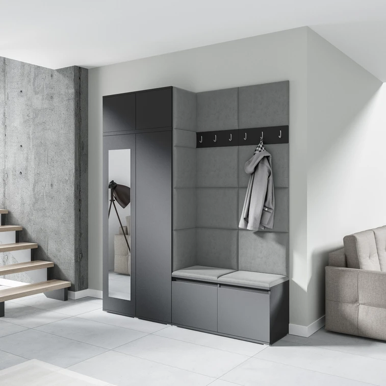 Predsieňová stena Emi 19. Obsahuje: 1x šatníkovú skriňu so zrkadlom, 1x predĺženie šatníkovej skrine, 1x botník, 1x vešiak, 15x čalúnené panely. Čalúnené panely sa montujú priamo na stenu, na skriňu a na botník pomocou lepidla. Lepidlo nie je súčasťou balenia.