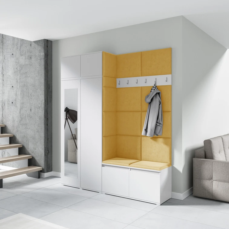 Predsieňová stena Emi 19. Obsahuje: 1x šatníkovú skriňu so zrkadlom, 1x predĺženie šatníkovej skrine, 1x botník, 1x vešiak, 15x čalúnené panely. Čalúnené panely sa montujú priamo na stenu, na skriňu a na botník pomocou lepidla. Lepidlo nie je súčasťou balenia.