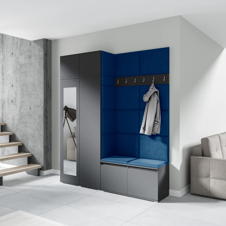 Predsieňová stena Emi 19. Obsahuje: 1x šatníkovú skriňu so zrkadlom, 1x predĺženie šatníkovej skrine, 1x botník, 1x vešiak, 15x čalúnené panely. Čalúnené panely sa montujú priamo na stenu, na skriňu a na botník pomocou lepidla. Lepidlo nie je súčasťou balenia.