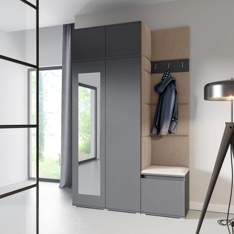 Predsieňová stena Emi 20. Obsahuje: 1x šatníkovú skriňu so zrkadlom, 1x rozšírenie šatníkovej skrine, 1x botník, 1x vešiak, 10x čalúnené panely. Čalúnené panely sa montujú priamo na stenu, na skriňu a na botník pomocou lepidla. Lepidlo nie je súčasťou balenia.
