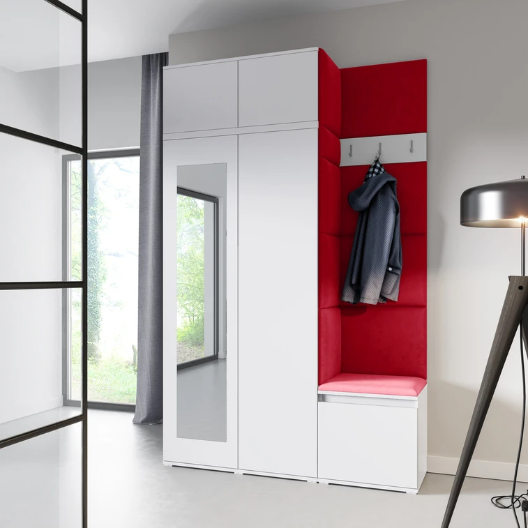 Predsieňová stena Emi 20. Obsahuje: 1x šatníkovú skriňu so zrkadlom, 1x rozšírenie šatníkovej skrine, 1x botník, 1x vešiak, 10x čalúnené panely. Čalúnené panely sa montujú priamo na stenu, na skriňu a na botník pomocou lepidla. Lepidlo nie je súčasťou balenia.