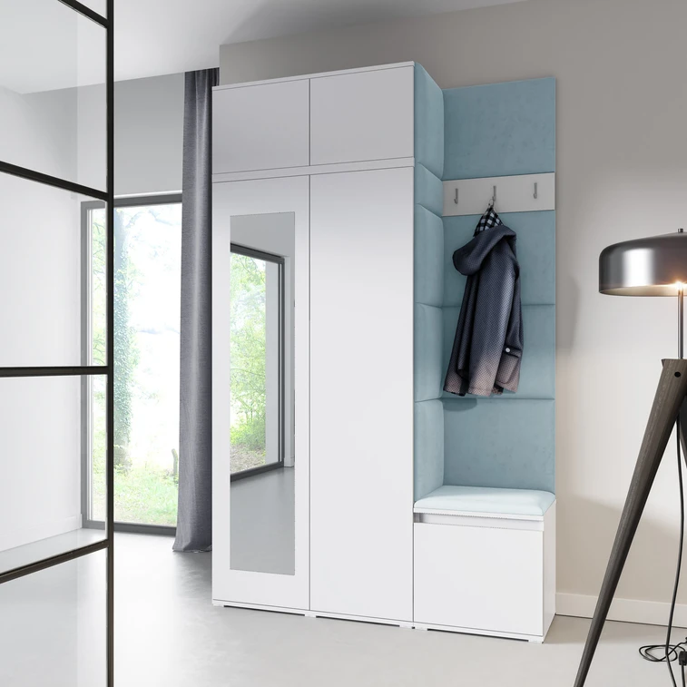Predsieňová stena Emi 20. Obsahuje: 1x šatníkovú skriňu so zrkadlom, 1x rozšírenie šatníkovej skrine, 1x botník, 1x vešiak, 10x čalúnené panely. Čalúnené panely sa montujú priamo na stenu, na skriňu a na botník pomocou lepidla. Lepidlo nie je súčasťou balenia.