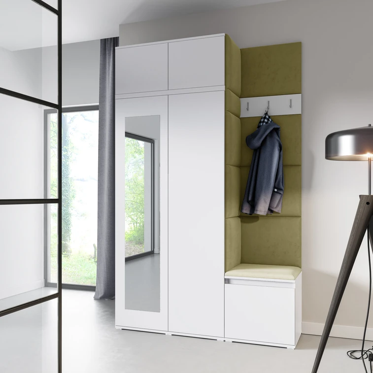 Predsieňová stena Emi 20. Obsahuje: 1x šatníkovú skriňu so zrkadlom, 1x rozšírenie šatníkovej skrine, 1x botník, 1x vešiak, 10x čalúnené panely. Čalúnené panely sa montujú priamo na stenu, na skriňu a na botník pomocou lepidla. Lepidlo nie je súčasťou balenia.
