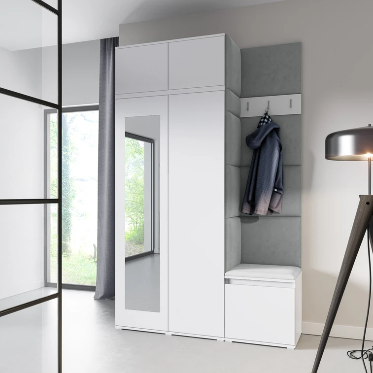 Predsieňová stena Emi 20. Obsahuje: 1x šatníkovú skriňu so zrkadlom, 1x rozšírenie šatníkovej skrine, 1x botník, 1x vešiak, 10x čalúnené panely. Čalúnené panely sa montujú priamo na stenu, na skriňu a na botník pomocou lepidla. Lepidlo nie je súčasťou balenia.
