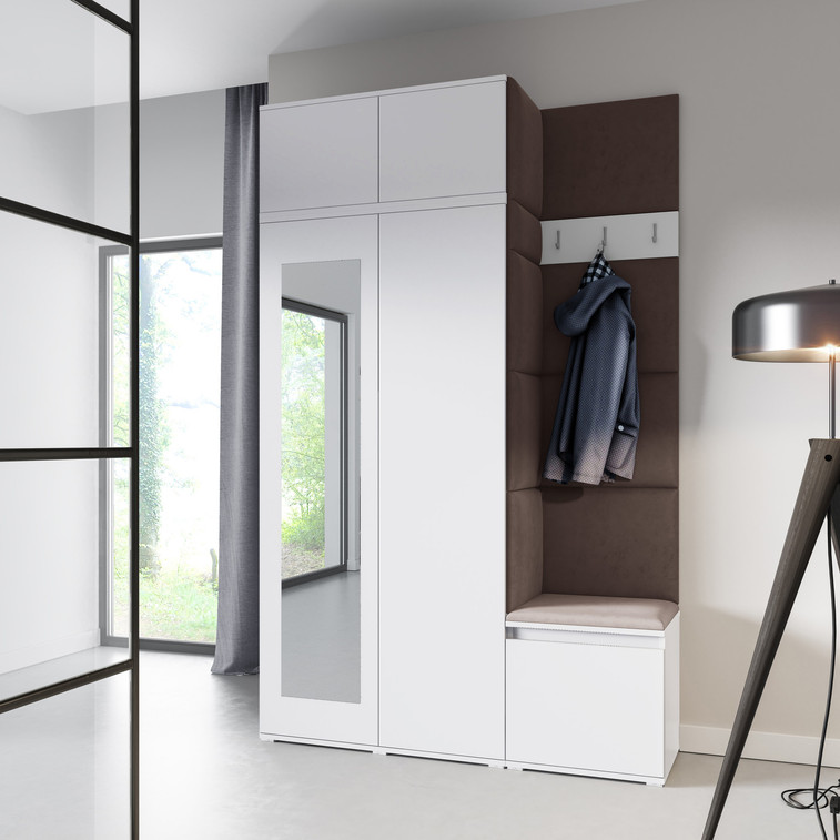 Predsieňová stena Emi 20. Obsahuje: 1x šatníkovú skriňu so zrkadlom, 1x rozšírenie šatníkovej skrine, 1x botník, 1x vešiak, 10x čalúnené panely. Čalúnené panely sa montujú priamo na stenu, na skriňu a na botník pomocou lepidla. Lepidlo nie je súčasťou balenia.
