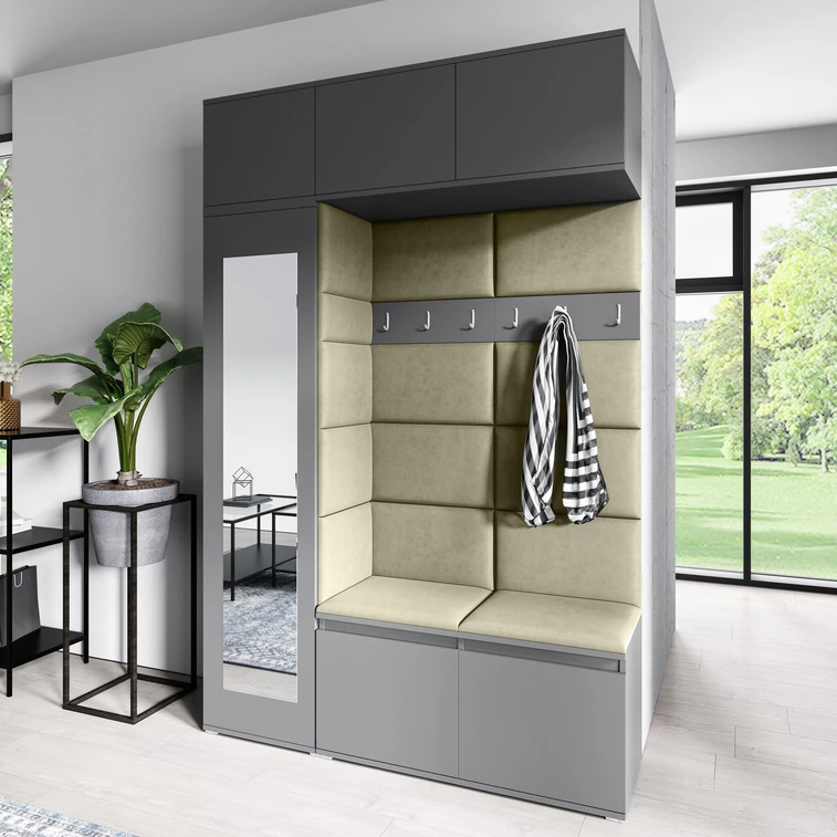 Predsieňová stena Emi 21. Obsahuje: 1x šatníkovú skriňu so zrkadlom, 1x predĺženie šatníkovej skrine, 1x závesná skrinka, 1x botník, 1x vešiak, 15x čalúnené panely. Čalúnené panely sa montujú priamo na stenu, na skriňu a na botník pomocou lepidla. Lepidlo nie je súčasťou balenia.