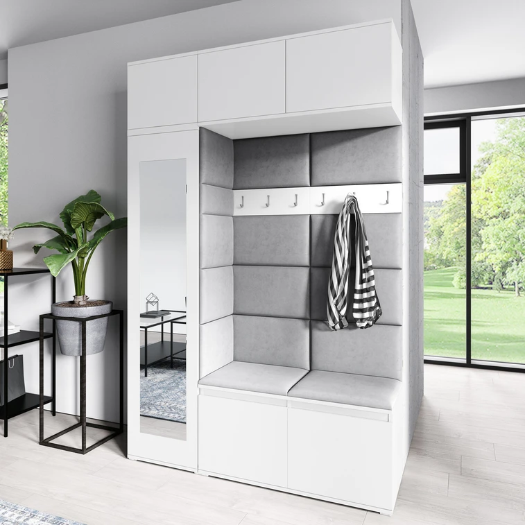 Predsieňová stena Emi 21. Obsahuje: 1x šatníkovú skriňu so zrkadlom, 1x predĺženie šatníkovej skrine, 1x závesná skrinka, 1x botník, 1x vešiak, 15x čalúnené panely. Čalúnené panely sa montujú priamo na stenu, na skriňu a na botník pomocou lepidla. Lepidlo nie je súčasťou balenia.