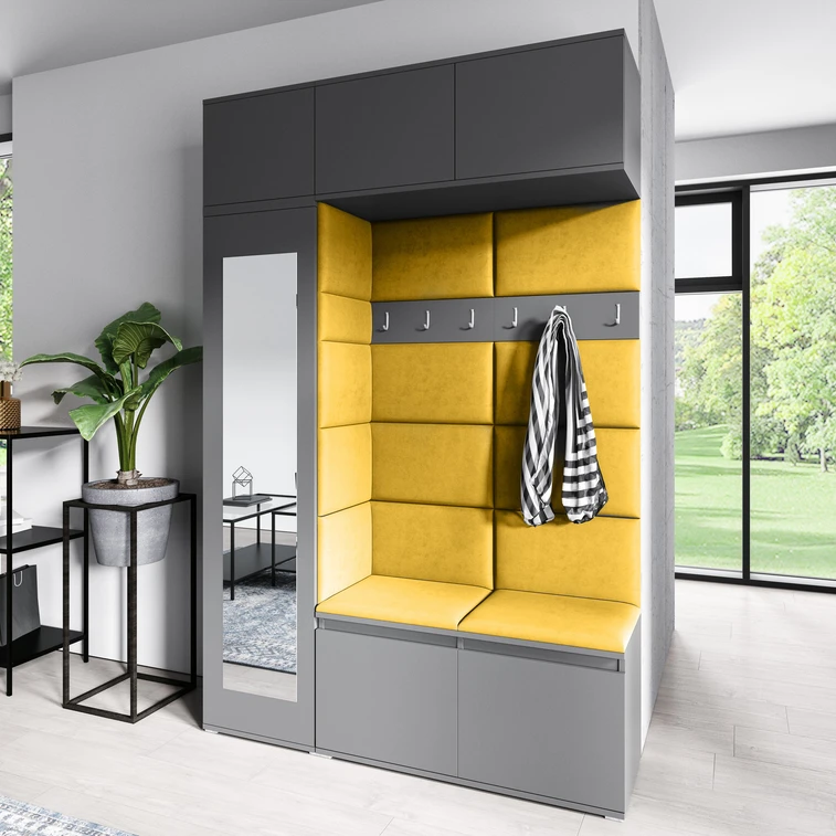 Predsieňová stena Emi 21. Obsahuje: 1x šatníkovú skriňu so zrkadlom, 1x predĺženie šatníkovej skrine, 1x závesná skrinka, 1x botník, 1x vešiak, 15x čalúnené panely. Čalúnené panely sa montujú priamo na stenu, na skriňu a na botník pomocou lepidla. Lepidlo nie je súčasťou balenia.