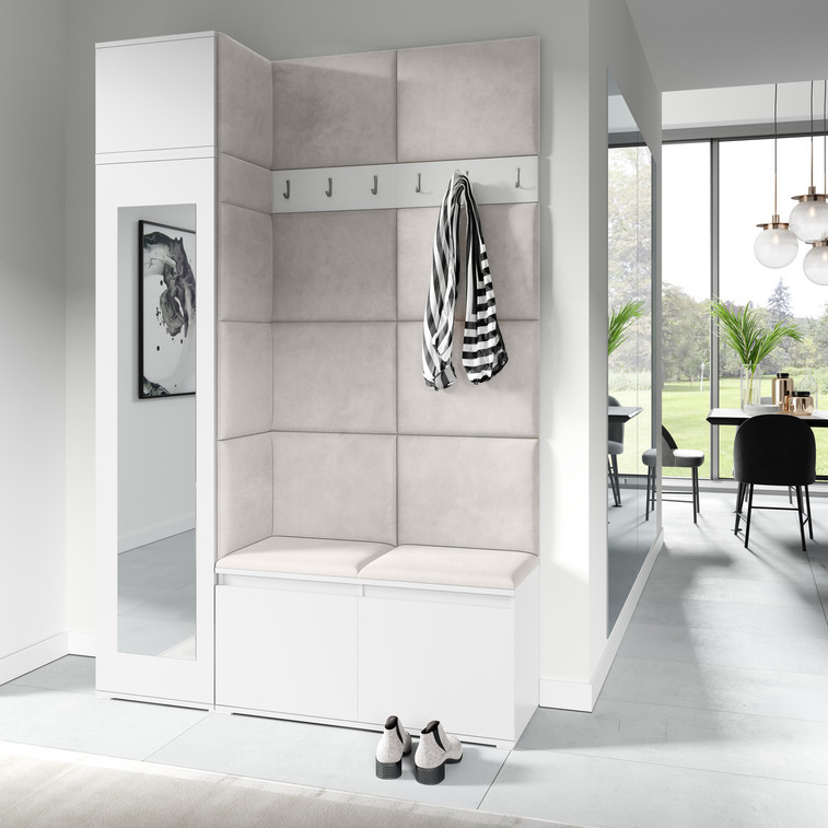 Predsieňová stena Emi 22. Obsahuje: 1x šatníková skriňa so zrkadlom, 1x závesná skrinka, 1x botník, 1x vešiak, 15x čalúnené panely. Čalúnené panely sa montujú priamo na stenu, na skriňu a na botník pomocou lepidla. Lepidlo nie je súčasťou balenia.