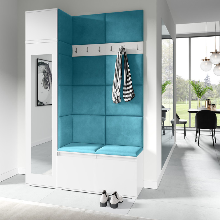 Predsieňová stena Emi 22. Obsahuje: 1x šatníková skriňa so zrkadlom, 1x závesná skrinka, 1x botník, 1x vešiak, 15x čalúnené panely. Čalúnené panely sa montujú priamo na stenu, na skriňu a na botník pomocou lepidla. Lepidlo nie je súčasťou balenia.