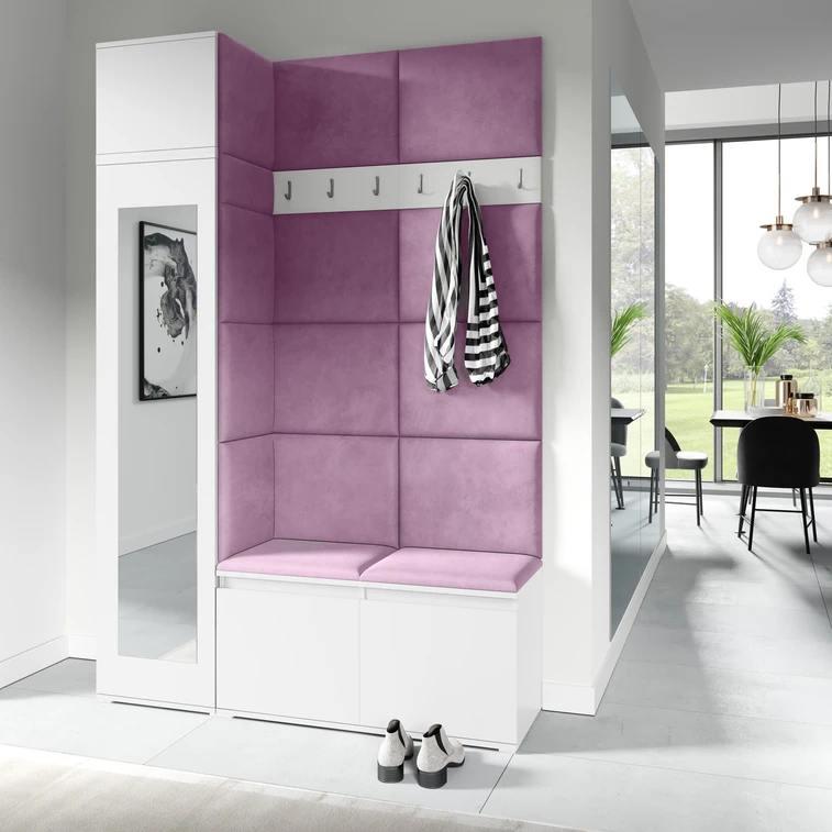 Predsieňová stena Emi 22. Obsahuje: 1x šatníková skriňa so zrkadlom, 1x závesná skrinka, 1x botník, 1x vešiak, 15x čalúnené panely. Čalúnené panely sa montujú priamo na stenu, na skriňu a na botník pomocou lepidla. Lepidlo nie je súčasťou balenia.